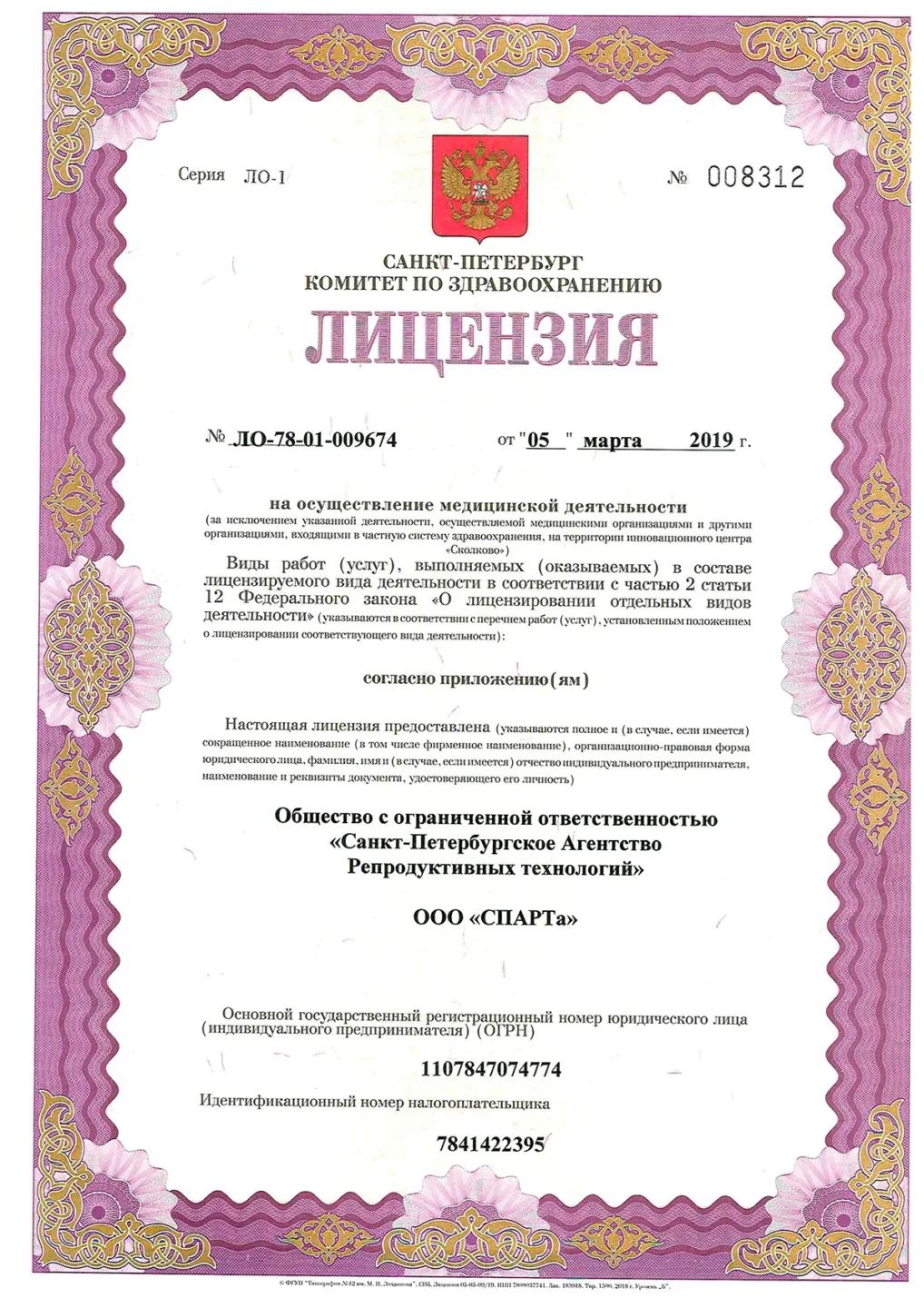 Наименование: Общество с ограниченной ответственностью «Санкт-Петербургское Агентство Репродуктивных Технологий»
